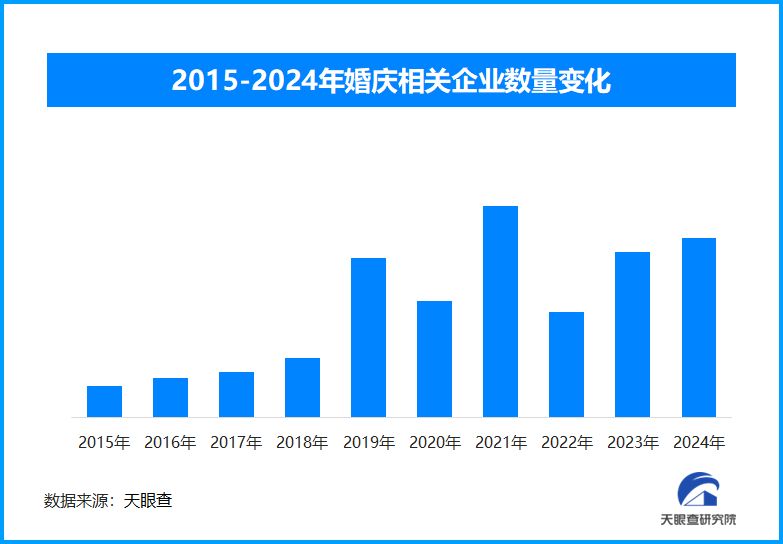 天眼查专业版数据显示,截至目前我国现存在业、存续状态的婚庆相关企业超157.3万家。其中,2025年截至目前新增注册相关企业约13.2万余家,从企业注册数量趋势来看,近十年间,婚庆相关企业的注册数量呈现出不稳定的增长态势,曾出现过2019和2021年两个新增高峰,但紧接着又伴随着增长下降。