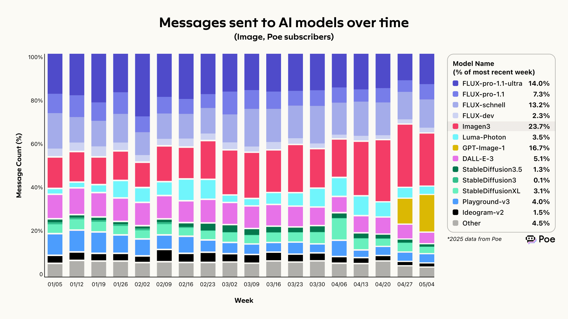 Poe 是知名模型聚合商,套了 100 个 AI 模型可以给用户访问,前两天Poe发布了今年的AI用量报告,相比与各家的自说自话,poe相对中立的视角更有参考价值。