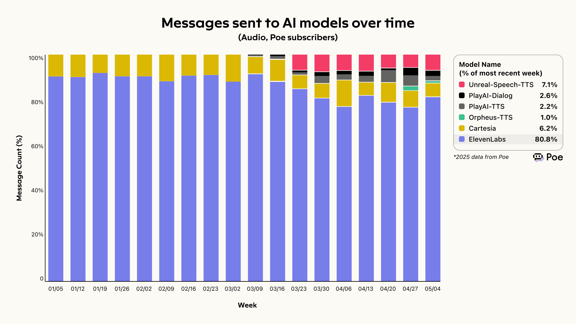 ElevenLabs 在音频生成领域占据主导地位,拿下了约 80% 的文本到语音请求。