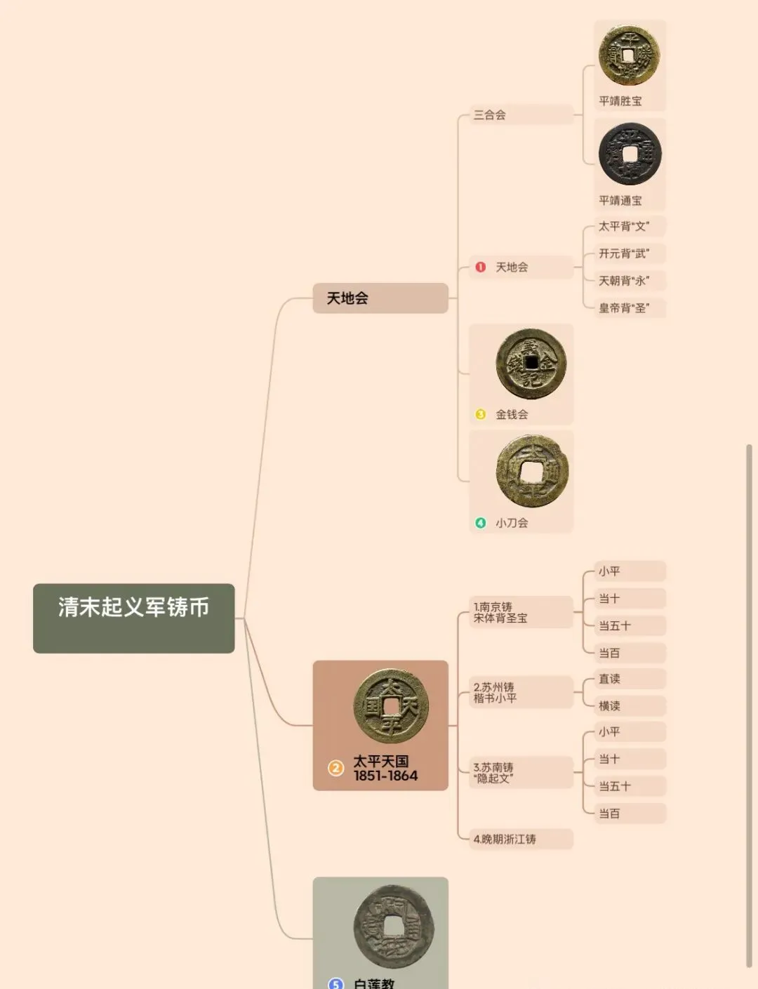 太平天国1851年宣告起义,1864年天京城破结束,它只是反清力量最大的一个,在它之前和之后一直都有反清力量,有的还相当大。当时反清力量,在南方主要是太平天国和天地会(三合会、金钱会、小刀会),在北方是捻军,当太平天国起义之后,这两股力量和太平天国有合流,甚至太平天国灭亡之后,太平天国的主要将领加入捻军,成了捻军主要将领。当时最强的四股力量:天地会,太平天国,捻军,少数民族起义及其他零散起义,各有特点,彼此之间有的会有联系。其中铸币的有以下: