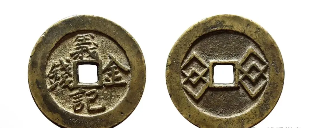 清咸丰十一年(1861年)浙江金钱会铸币,所见均为折十型,背由方胜及天、地、离等字样。当时咸丰八年后不久赵启改用旧钱 (康熙、乾隆、道光等清小平钱)熔铜铸造方孔圆钱“义记金钱”。“金”字头部从“入”,以示入会之意,“义”字从“八”以示8兄弟重义守信之意。背文为两方连结图,表示会员间永远手拉手心连心,作为金钱会会员证明用。