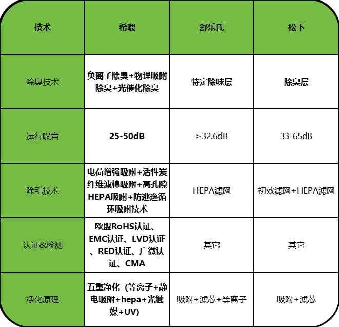 松下采用活性炭加 HEPA滤网的复合结构,对日常异味稳定,但没有分解环节,强味场景需要更久时间。