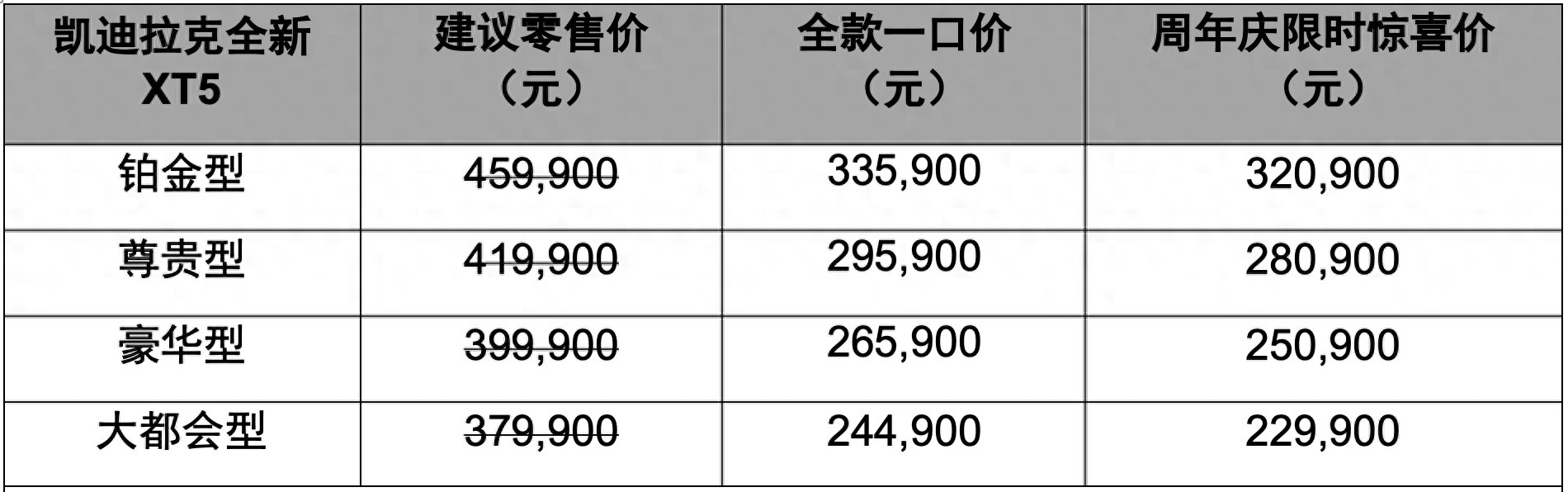 在2025成都车展期间,凯迪拉克XT5新增大都会型上市(下文简称为XT5),官方指导为37.99万元,全款一口价为24.49万元。同时,凯迪拉克针对XT5全系车型推出周年庆限时惊喜价为22.99万元起。从全系款型设置来看,本次上市的XT5大都会型为新增两驱入门版,从而使全系起售价(指导价)降低2万元。本次款型调整后,XT5系列从此前全系仅提供三款四驱车型,调整为一款两驱和三款四驱共四个款型可选。