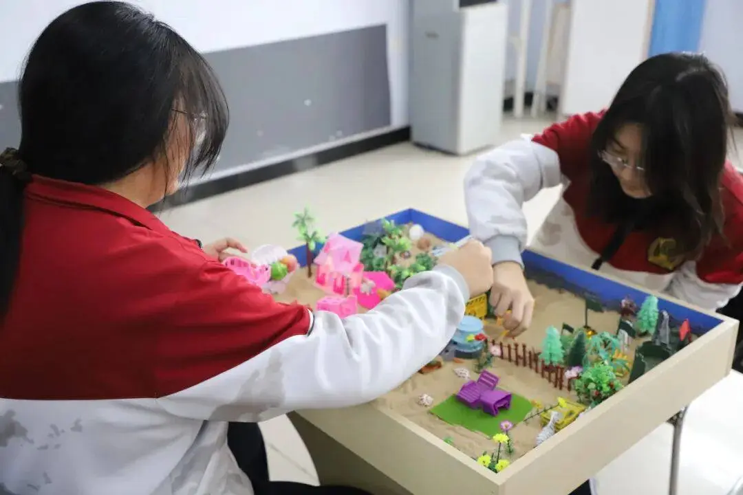 细腻的沙粒被抚平,成为一片等待创造的“土地”。同学们从陈列架上选取各式微缩模型——房屋、树木、桥梁、人物,在沙盘上搭建属于自己的场景。这个看似游戏的过程,实则是内心世界的无声表达。指尖划过沙粒的触感,物件摆放时的思考与调整,都在不知不觉中帮助整理思绪,让模糊的感受变得清晰可见。