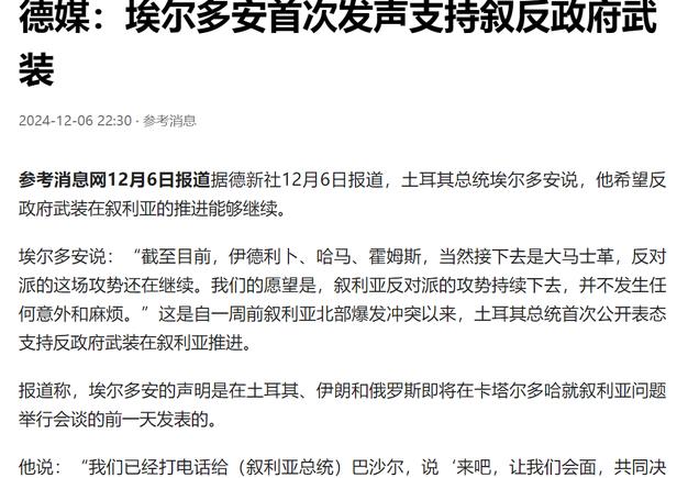 2024年12月6日,德国媒体德新社报道说,土耳其总统埃尔多安希望“反政府武装在叙利亚的推进能够继续。”