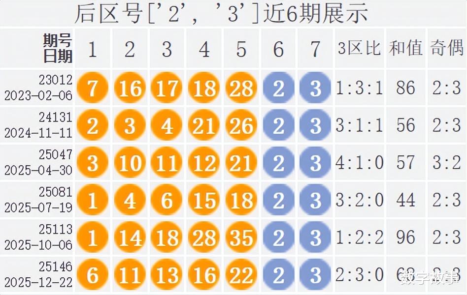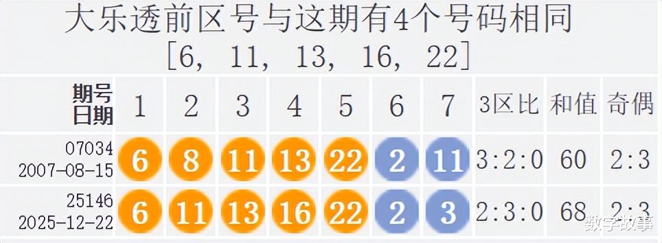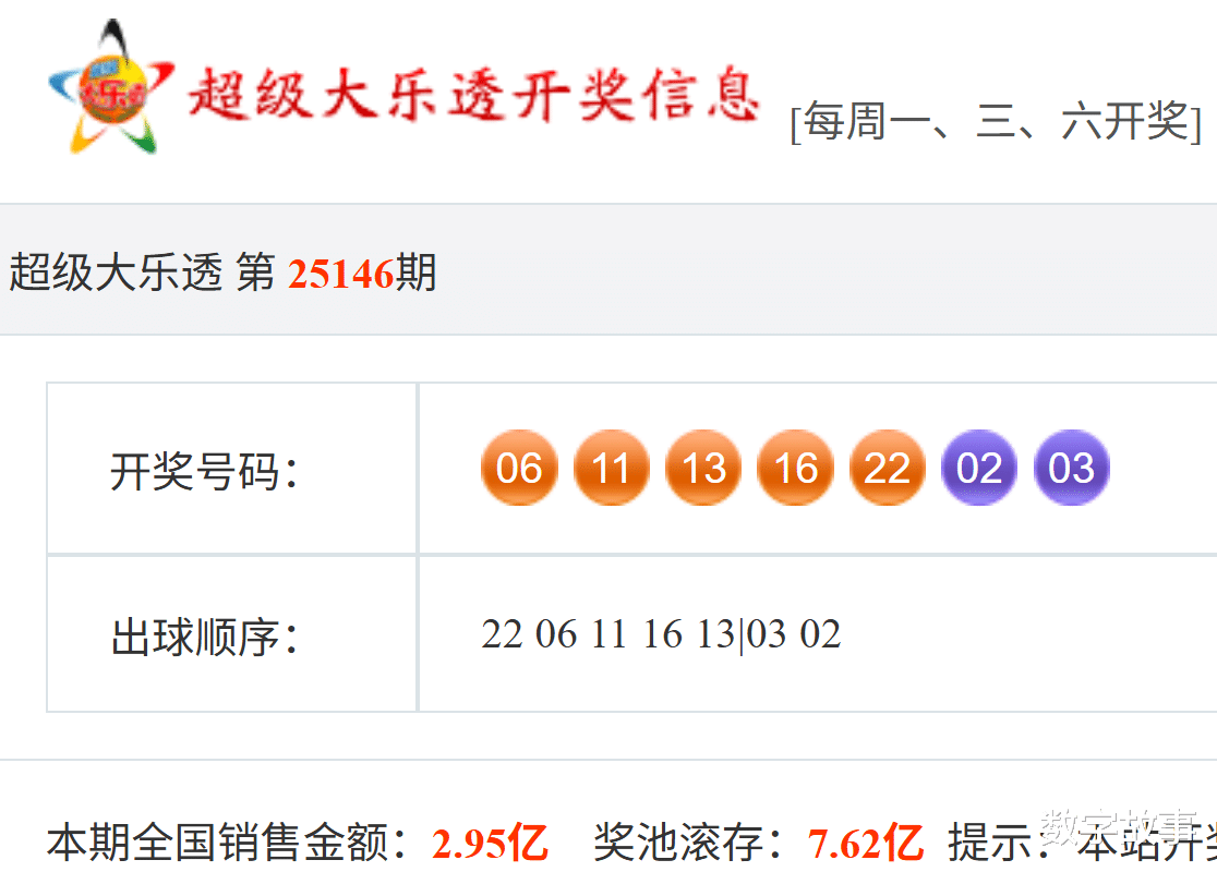 大乐透25146期开奖结果及中奖情况:出奖时间: 2025-12-22 星期一 前区号:6-11-13-16-22后区号:2-3大乐透前区重号叠码:22前区隔期下落:13前区奇偶比:2:3 前区和值:68前区跨度:16 三区比:2:3:0没有连号