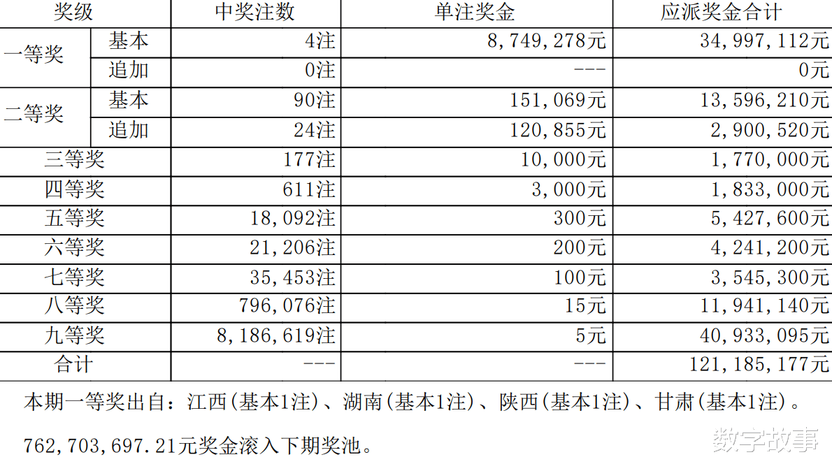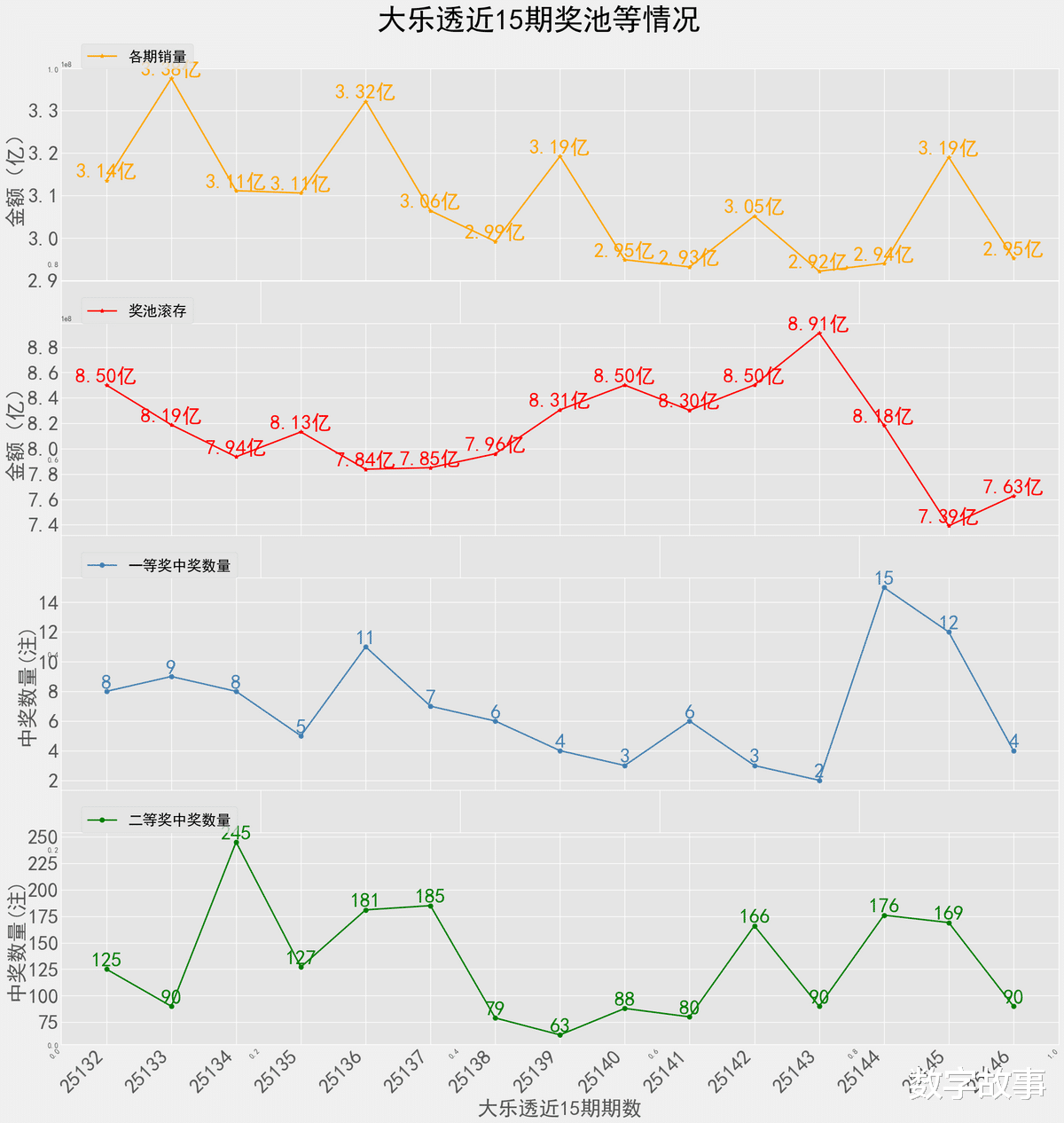 大乐透25146期一等奖:4注,追加: 0注二等奖:90注,追加: 24注。本期全国销售金额:2.953 亿 奖池滚存:7.627 亿.近15期奖池滚存, 中奖情况等信息:
