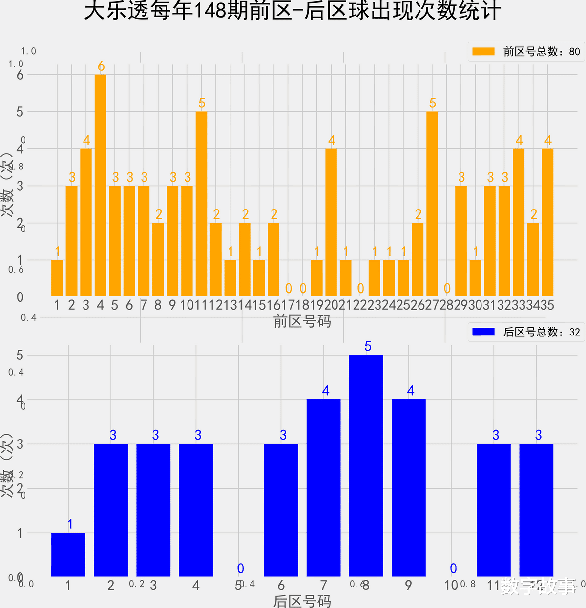 统计每年147期的样本数据: 80个前区号 32个后区号