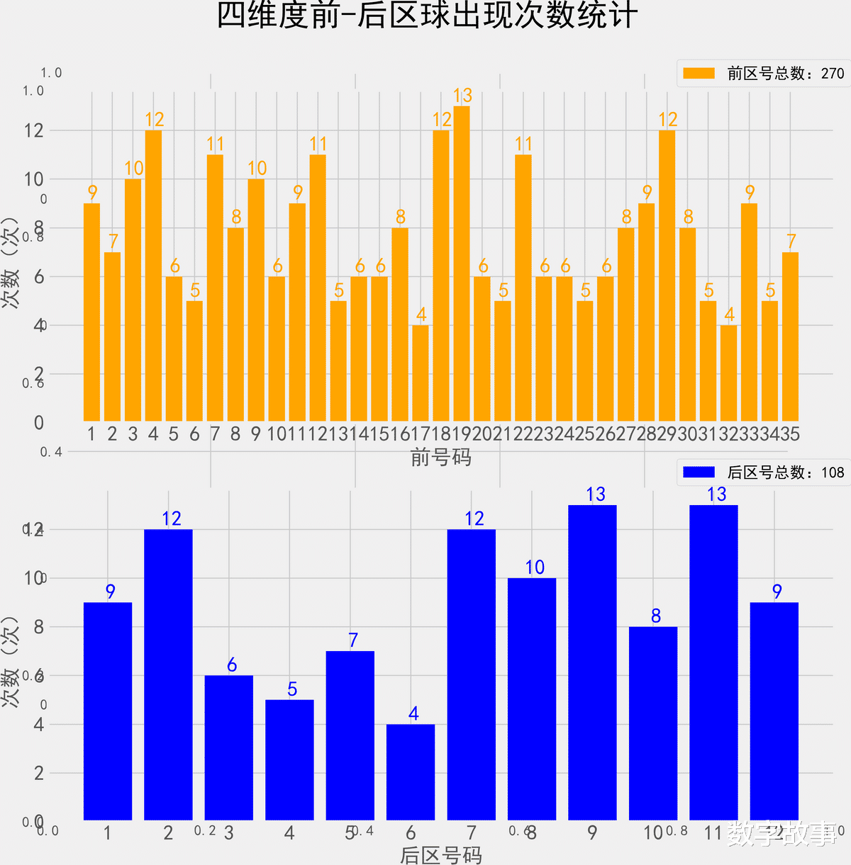 => 统计出现概率综合以上4个纬度的号码,共54期根据出现次数,分为热号,冷号,其他的为温号。统计样本数据: 270个前区号码 108个后区号码