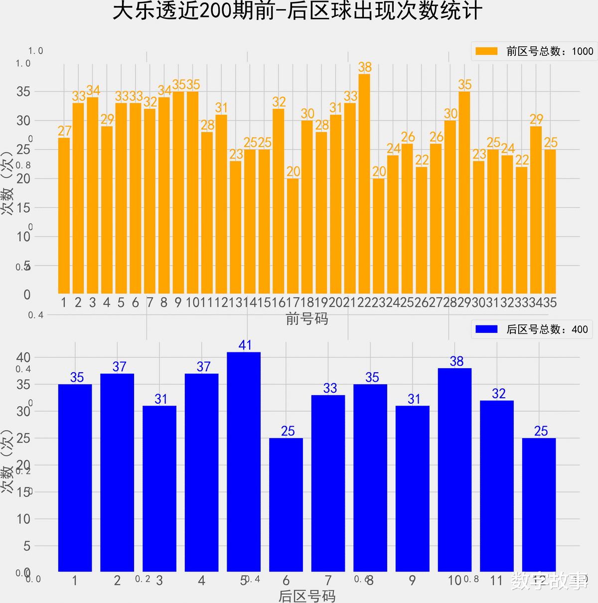 大乐透近200期前后区号统计情况统计样本数据: 1000个前区号码 400个后区号码