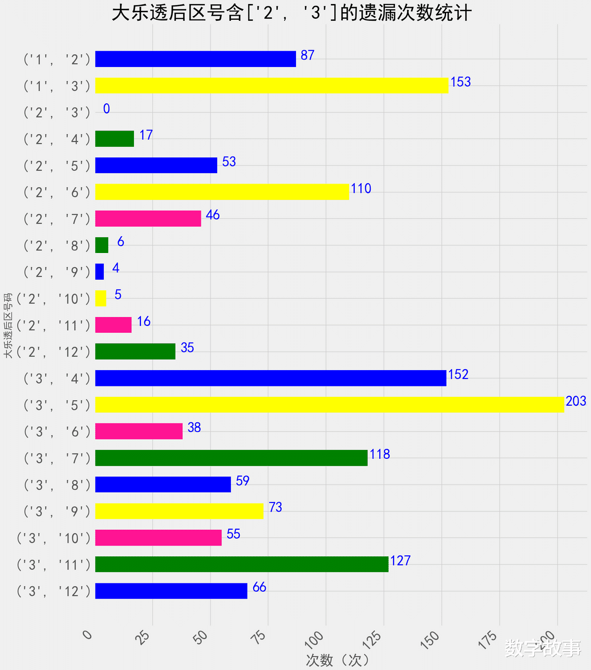 大乐透后区含2或3的双号遗漏次数统计大乐透后区组合2-3近150期出了4次,这次中断了32期遗漏。