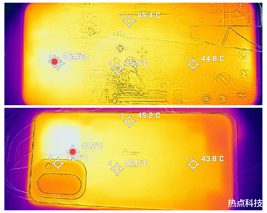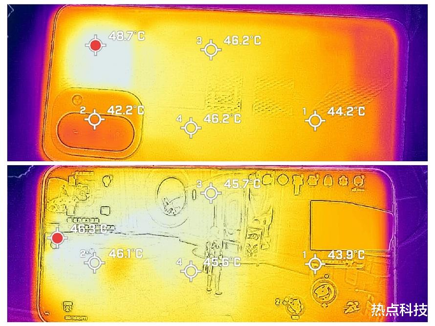 游戏结束之后,红外测温仪实测一加Ace 6T机身背面最高温度达到47.9℃,手机屏幕的最高温度为46.8℃。
