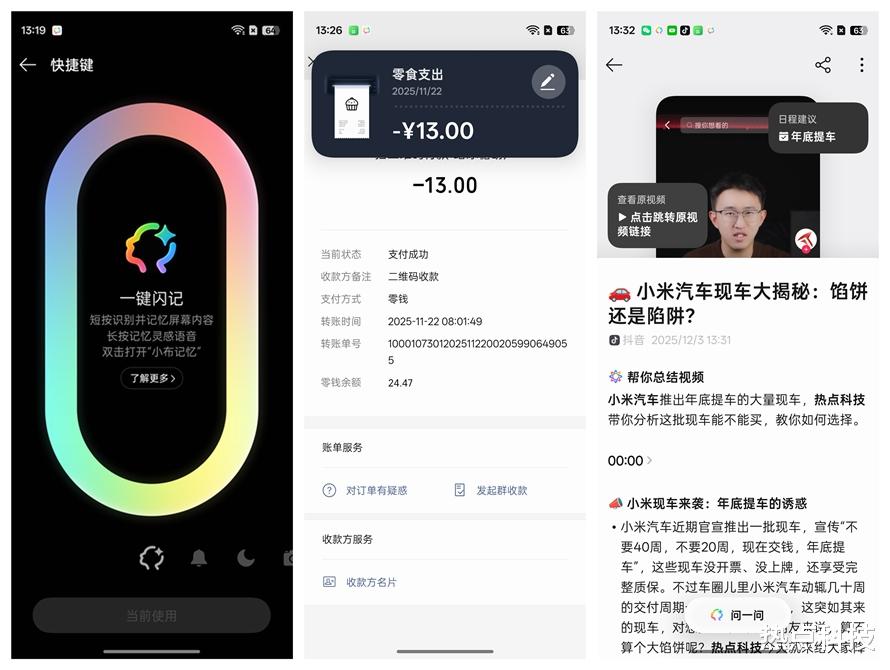 AI也是ColorOS 16的核心一大看点,其中小布记忆是一个实用且有趣的功能,将小布记忆设置为快捷功能键之后,按一下就可以直接对当前手机页面分析并记录,比如付账界面会帮你记账,识别到文章会帮忙总结,抖音、B站视频可以解析视频,总结视频,并且分时间线帮你快速分段落了解视频内容,非常的好用。