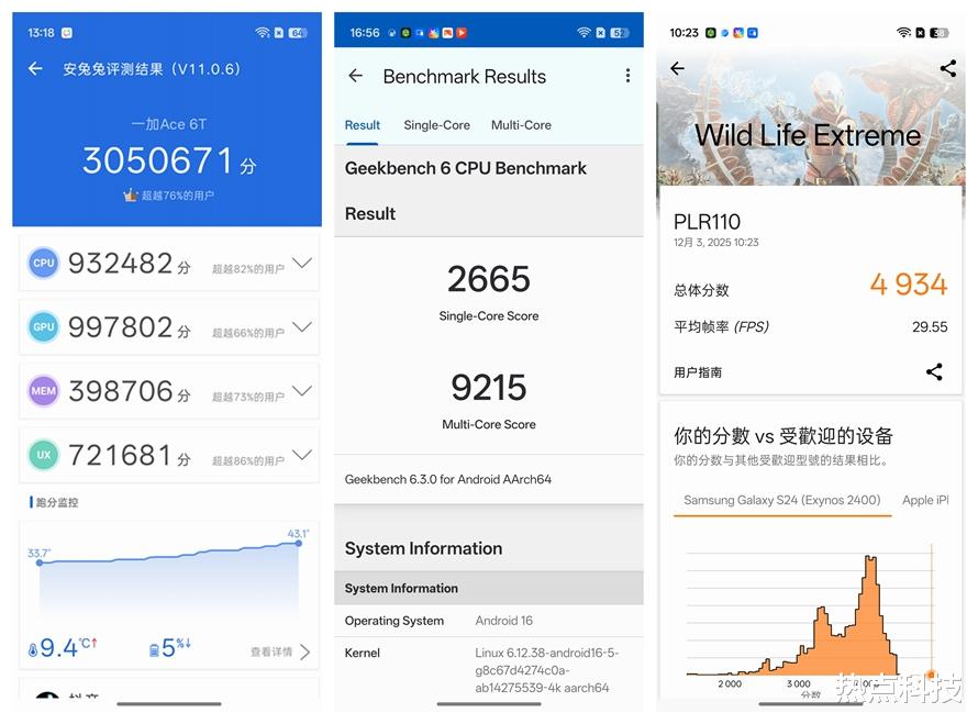 理论性能测试,一加Ace 6T在安兔兔跑分实测是305万分,偏向处理器CPU性能测试的GeekBench6的单核成绩为2665分,多核成绩为9215分,偏向GPU的3D Mark Wild Life Extreme的一加Ace 6T的成绩为4934分,性能表现要稍弱于骁龙8至尊版。