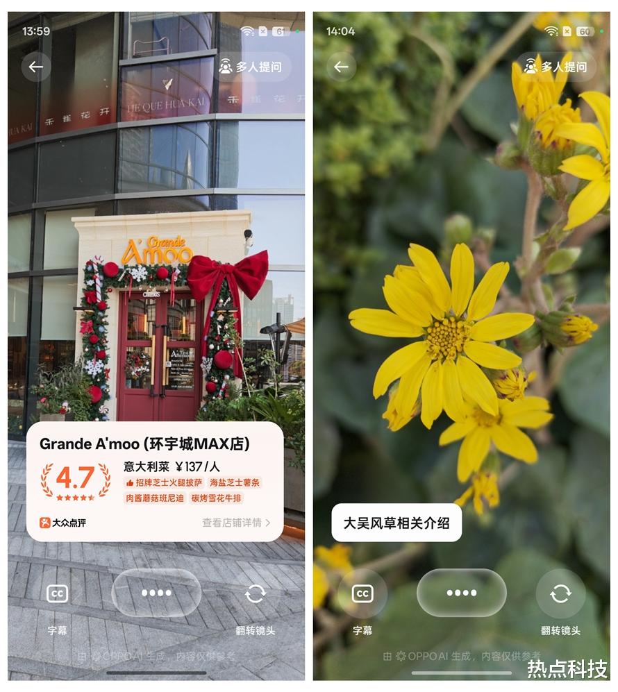 而新加入的AI功能还有很多,比如唤醒小布助手,可以直接调用摄像头实时拍摄画面,通过实时对话的方式来获得它所“看到”的画面,就相当于它在“看”,然后结合AI大模型来对看到的内容分析与整理,可以是你不懂的花草、英文菜单等等,甚至是犹豫要不要进去的店铺,让它看一眼就可以直接给到评分。