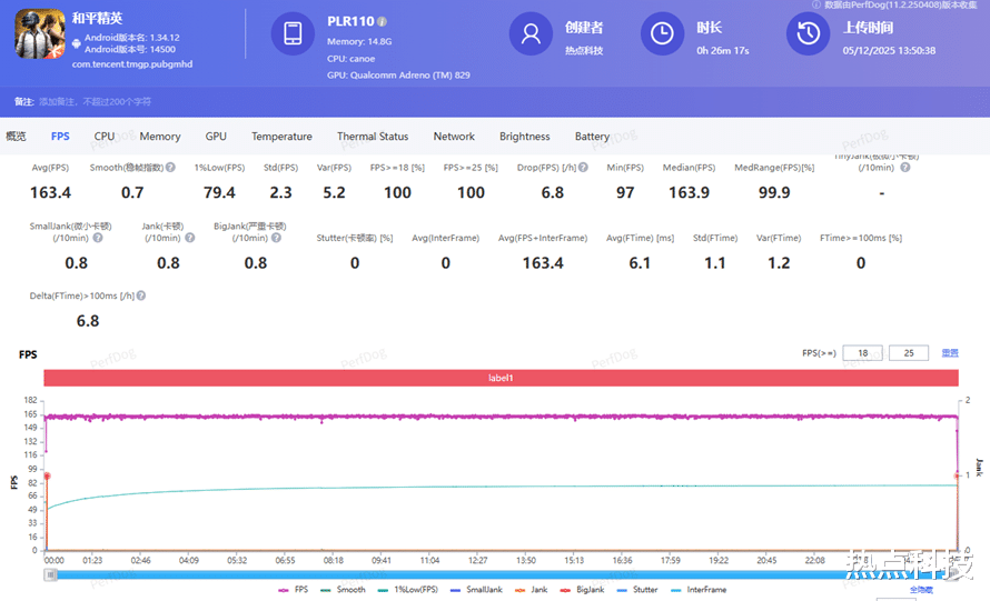 而且,这一次一加Ace 6T还首发上线了《和平精英》的流畅模式下165高帧率,实测可以一直稳定在165帧左右,一局玩下来平均游戏帧率163.4帧,游戏体验流畅,相应功耗增加至6.56W。