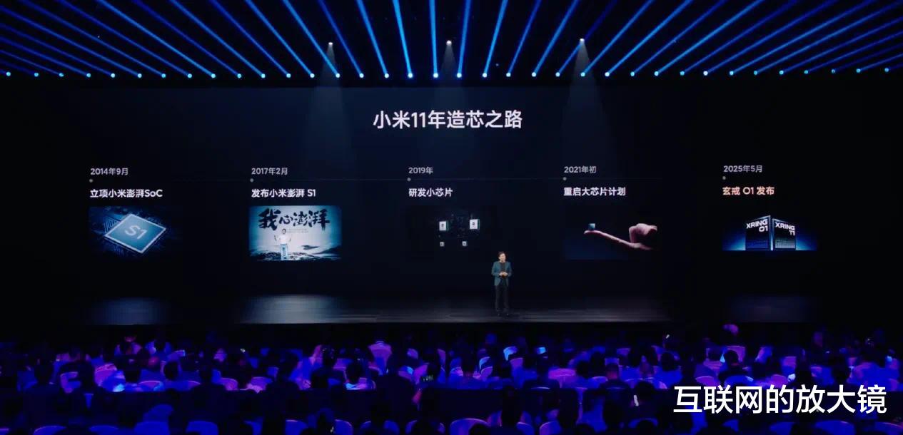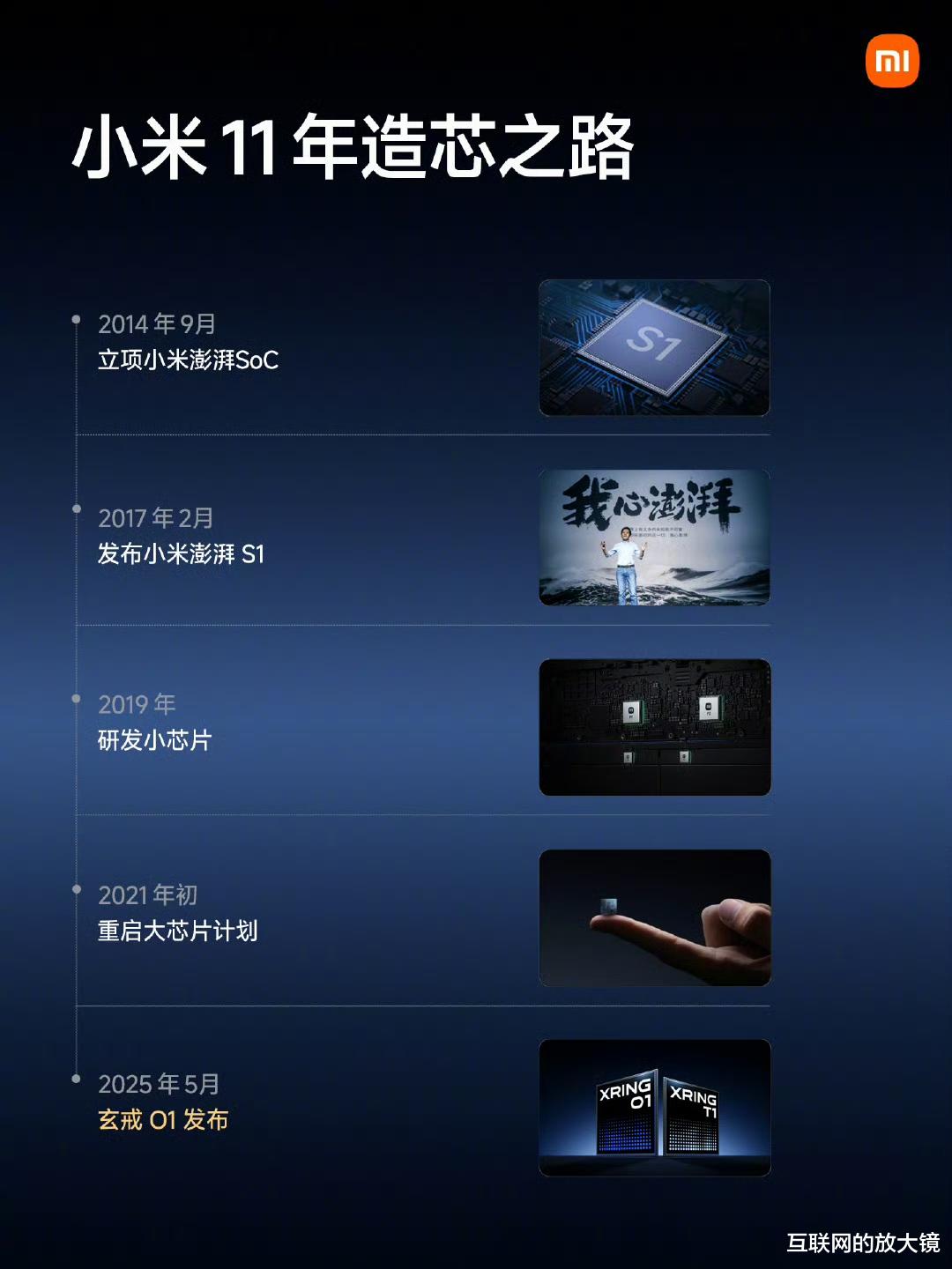 事实上,对于小米自研芯片,可能大多数人第一反应其实是惊讶。在2017年,小米曾经发布过自己的澎湃s1芯片,采用28纳米工艺,搭载在小米5C上,但彼时来看,这款芯片并不强悍,销量也不足以支撑小米在手机芯片上的继续探索,在2019年4月,小米对旗下全资子公司松果电子呢进行重组,将部分团队分拆组建新的公司大鱼半导体。松果电子继续聚焦手机soc和ai芯片的研发,大于半导体呢,则是专注于ai和IOT芯片的研发。2025年4月呢,小米再次对松果电子团队进行重组,而之后就是5月份这次发布会,小米直接拿出了玄界o1的手机soc芯片。