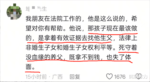 “姜润泽现在最该做的,是拿着有效证据去找他生父,法律上非婚生子女和婚生子女权利平等。死守着没血缘的养父,既拿不到钱,也失了体面。”