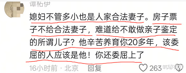 “媳妇不管多小也是人家合法妻子。房子票子不给合法妻子,难道给不敢做亲子鉴定的所谓儿子?他辛苦养育你20多年,该委屈的人应该是他!你还委屈上了!”