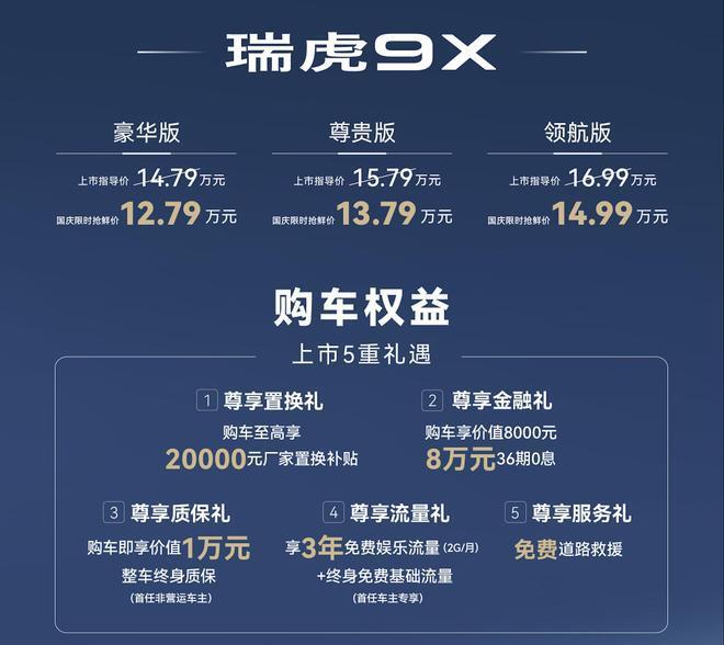 在新能源车们铺天盖地喊口号的时候,奇瑞却选择在国庆前夕,把“燃油大哥”瑞虎9家族整齐划一地推上了舞台,瑞虎9、瑞虎9 C-DM高能版,再加上带着全新身份亮相的瑞虎9X,一起登场。价格,先亮出来:12.79万起(抢鲜价),霎时、全场响起欢呼。