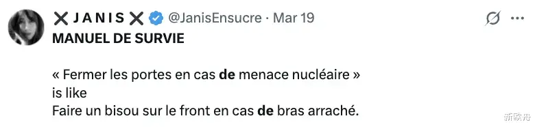 不过,这个“关门防核弹”的建议引发不少法国网友吐槽:“核弹来了,关门真的有用?”