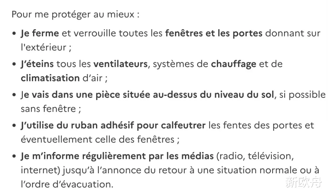 此外,政府还特别强调,所有家庭应在家中制定“紧急逃生计划”,确定家庭成员的集合地点、紧急联系人,以及房屋的电、水、气总开关位置,确保在危机中快速切断能源,防止次生灾害。第二部分的主题是突发危机来临时如何应对,面对不同危机,这本手册列出了具体应对措施。尤其在核泄漏或核打击时,法国政府提出了一个令人匪夷所思的建议——“关好门窗”: