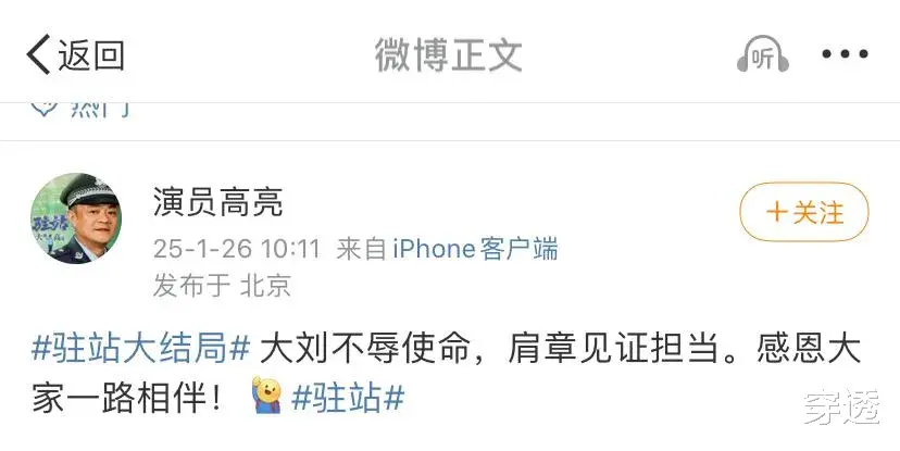 让人唏嘘的是,高亮去世十几天前,还曾发文对《驻站》电视剧收官表示,“大刘不辱使命,肩章见证担当。感恩大家一路相伴。”没想到现在已经去往天国。