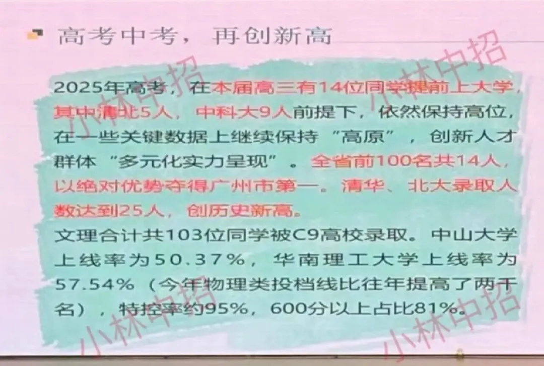 作为广州老派的四大豪门,省实战绩赫赫,2025年高考,全省前100名共14人,北大清华25人,600分以上81%(图片数据来源于小林中招)。