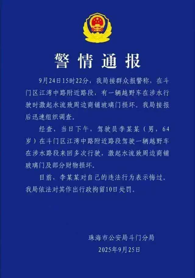 超强台风“桦加沙”袭击珠海当天,64岁的李某某驾驶越野车在斗门区江湾中路积水路段来回多次行驶,激起的水浪导致多家商铺玻璃门破损及财物损坏。周围群众拍摄的视频显示,该车辆行驶时激起巨大水浪,有人惊呼“海浪”,随后传来玻璃破碎声。
