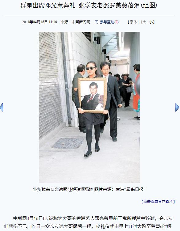 中国新闻网——群星出席邓光荣葬礼 张学友老婆罗美薇落泪(组图)