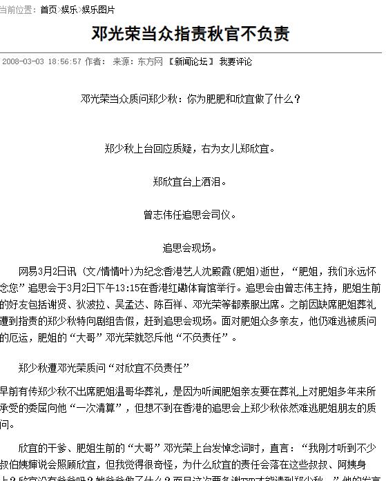 在葬礼上,邓光荣当着众多媒体和嘉宾的面,公开指责郑少秋没有尽到丈夫和父亲的责任,并要求他当场承诺今后会好好照顾女儿郑欣宜。