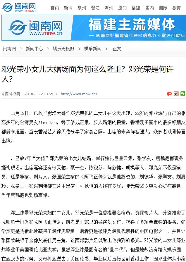 闽南网——邓光荣小女儿大婚场面为何这么隆重?邓光荣是何许人?