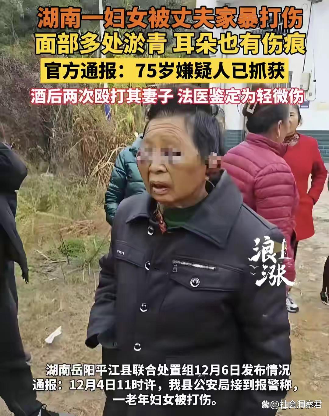 12月6日,平江县联合处置组发布了通报,详细说明了事件经过:12月2日至3日期间,刘某相饮酒后,先后两次对妻子陈某明实施殴打,导致陈某明多处受伤,经法医鉴定为轻微伤。目前,刘某相已被警方拘捕,案件正在进一步处理中。