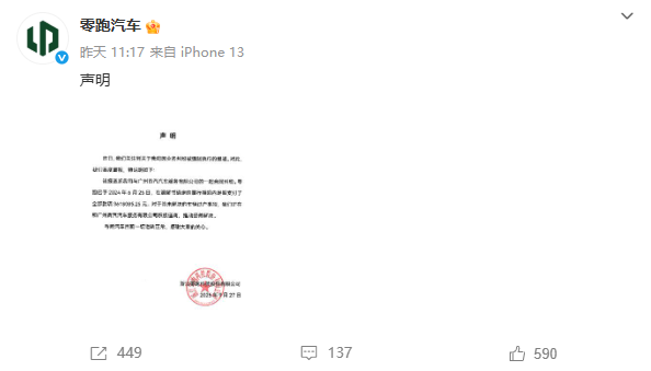 面对争议,零跑汽车于9月27日迅速发布声明,对事件细节进行澄清。声明中明确表示,网传的纠纷案件,公司已于2024年6月25日在法院调解书确定的履行期限内,足额支付了全部 361.8万元款项,不存在“拒不履行款项支付义务”的情况。