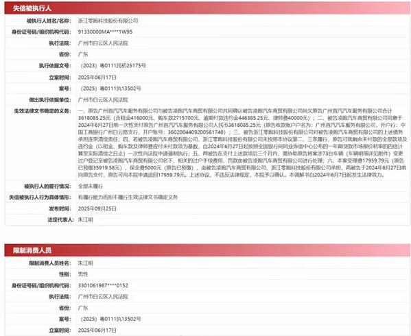 法院文书进一步指出,因零跑汽车“有履行能力而拒不履行生效法律文书确定义务”,已于2025年9月25日被列为失信被执行人,案号为(2025)粤 0111 执 13502 号;同时,公司法定代表人朱江明被列为限制消费人员,相关限消令由广州市白云区人民法院于2025年6月17日立案执行。