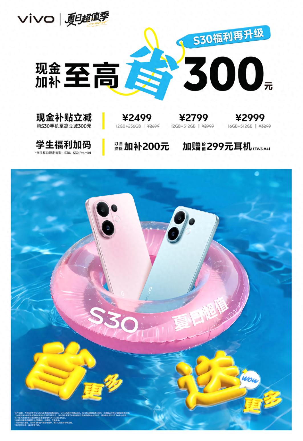 vivo S30不仅有满分颜值、旗舰级影像,还有贴合年轻用户需求的实用功能和超高性价比。加上现在暑促期间最多可省下近500元,错过真的太可惜了。