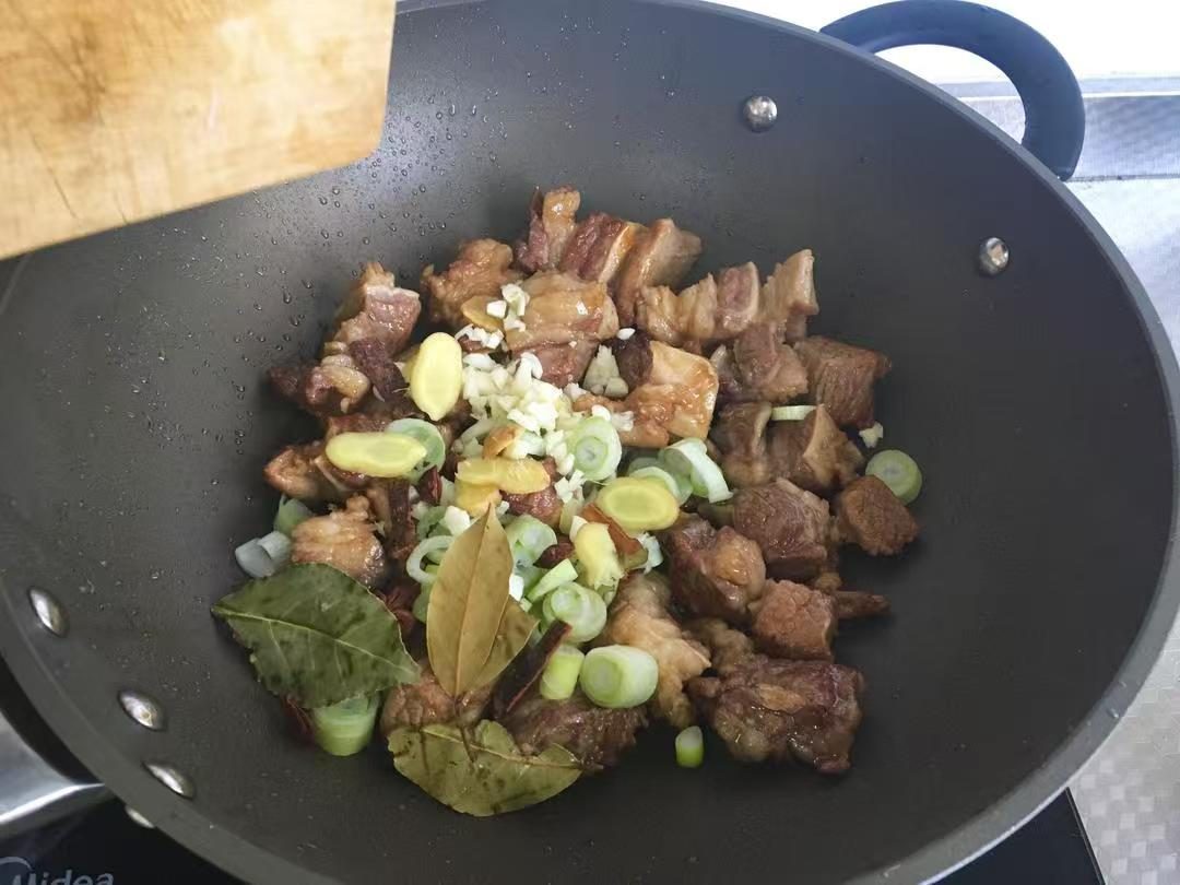 将牛腩炒至统一颜色且表面微焦时,迅速把葱姜蒜、八角、桂皮、香叶投入锅中,增添浓郁的香味。