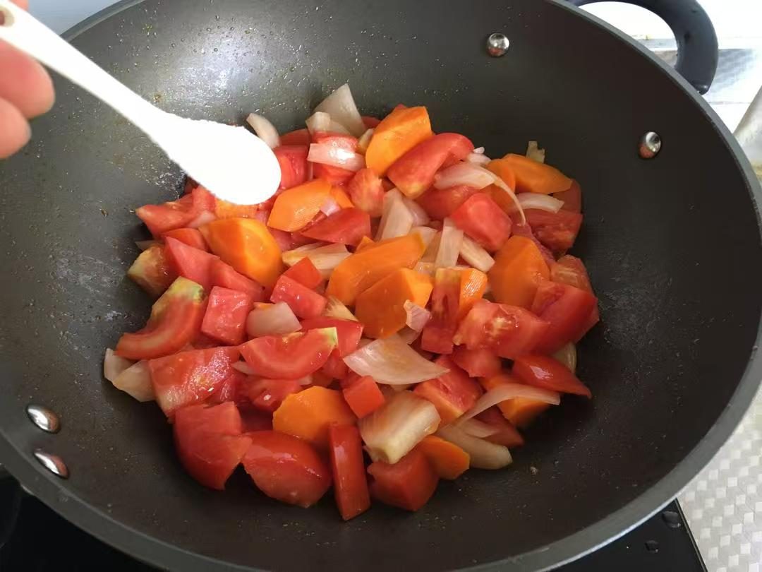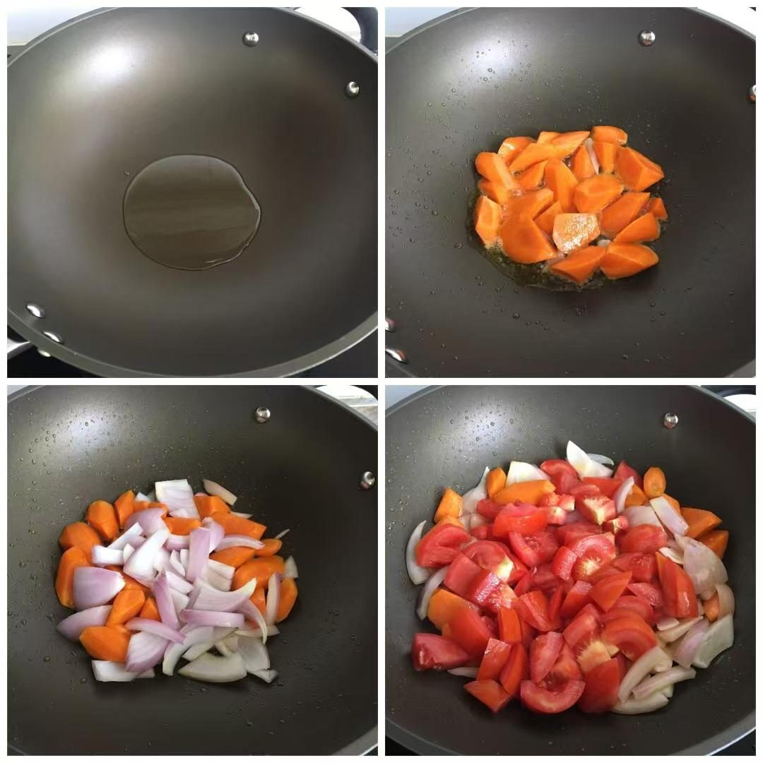 在锅内放入适量油,先将胡萝卜放入油煎一会儿,因为胡萝卜中的胡萝卜素是脂溶性的,经过油煎味道会更好。随后依次放入洋葱和番茄,让它们在锅中散发出各自的独特风味。