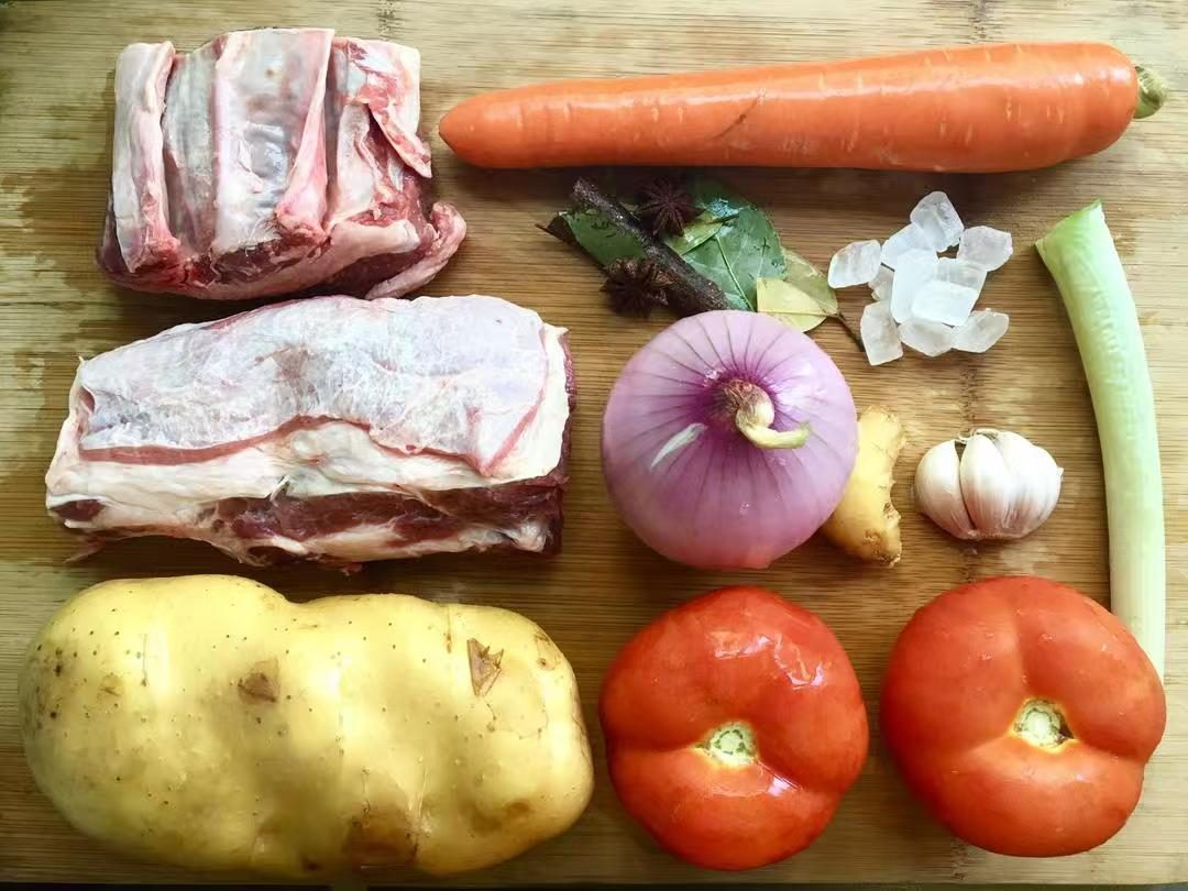 所需食材:牛腩、土豆、番茄、胡萝卜、大葱、姜片、洋葱、香叶、桂皮、八角、料酒、生抽、老抽、蚝油、盐、红烧酱油、冰糖、蒜。