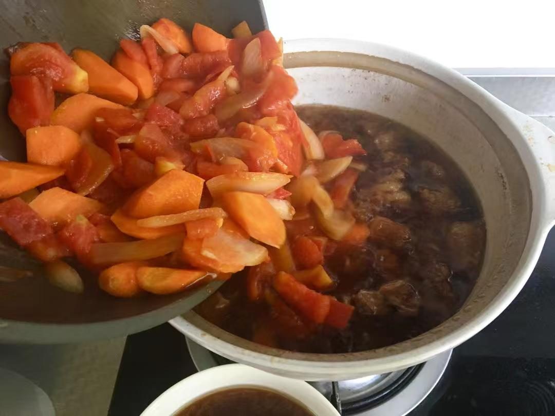 把炒好的番茄洋葱胡萝卜倒进砂锅一起炖。