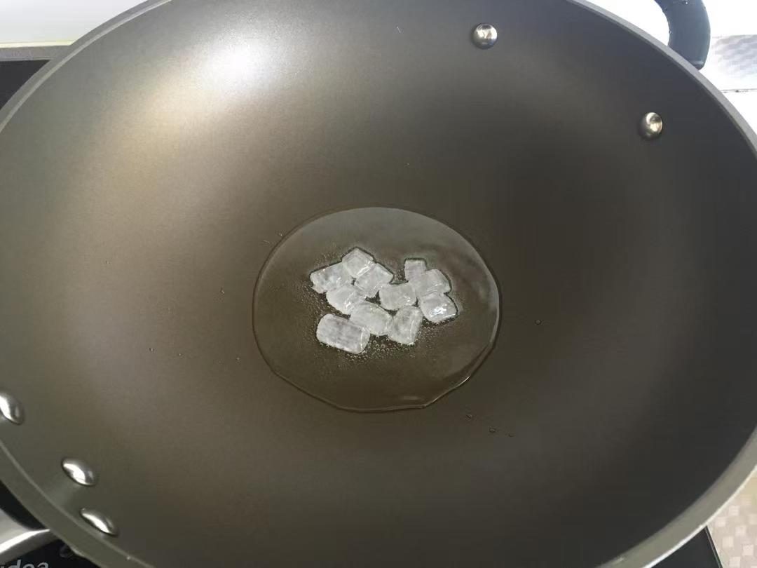 冷锅倒油放冰糖,中小火熬制冰糖。熬成焦糖色。