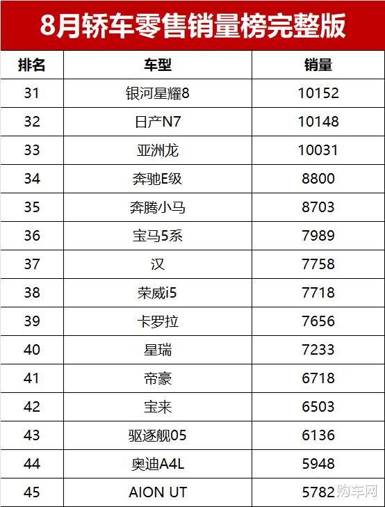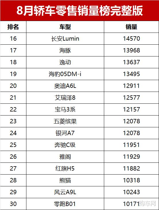 【2025年8月轿车零售销量排行榜 完整版】近日,乘联会公布了最新乘用车销量数据。数据显示,2025年8月国内轿车市场零售销量达到90.0万辆,同比小幅增长1.8%,环比7月份增长6.9%。新能源继续发挥领跑作用,在销量超过1万辆的33款轿车中,新能源占据了19款车型,且包揽本月轿车销量榜的前三名,而常规燃油车则只有14款车型破万辆。8月轿车销量榜!1-226名,比亚迪失冠,新能源霸榜前三,轩逸第四!