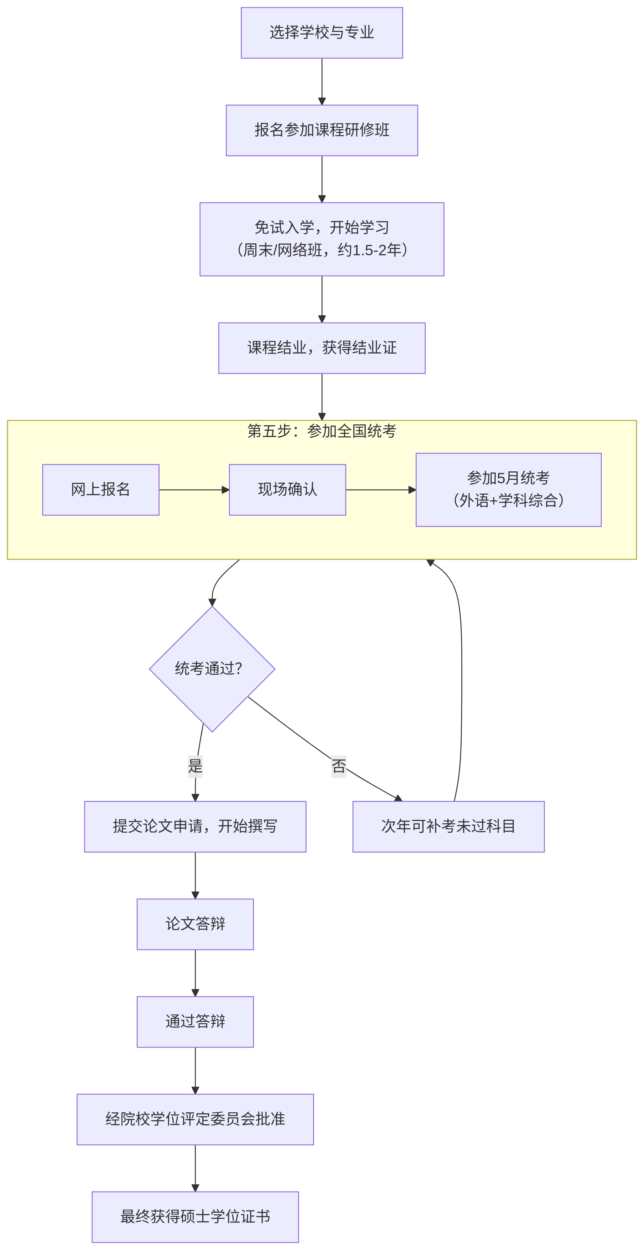 一个完整的同等学力申硕流程通常如下所示,它清晰地展示了从入学到获得学位的全过程: