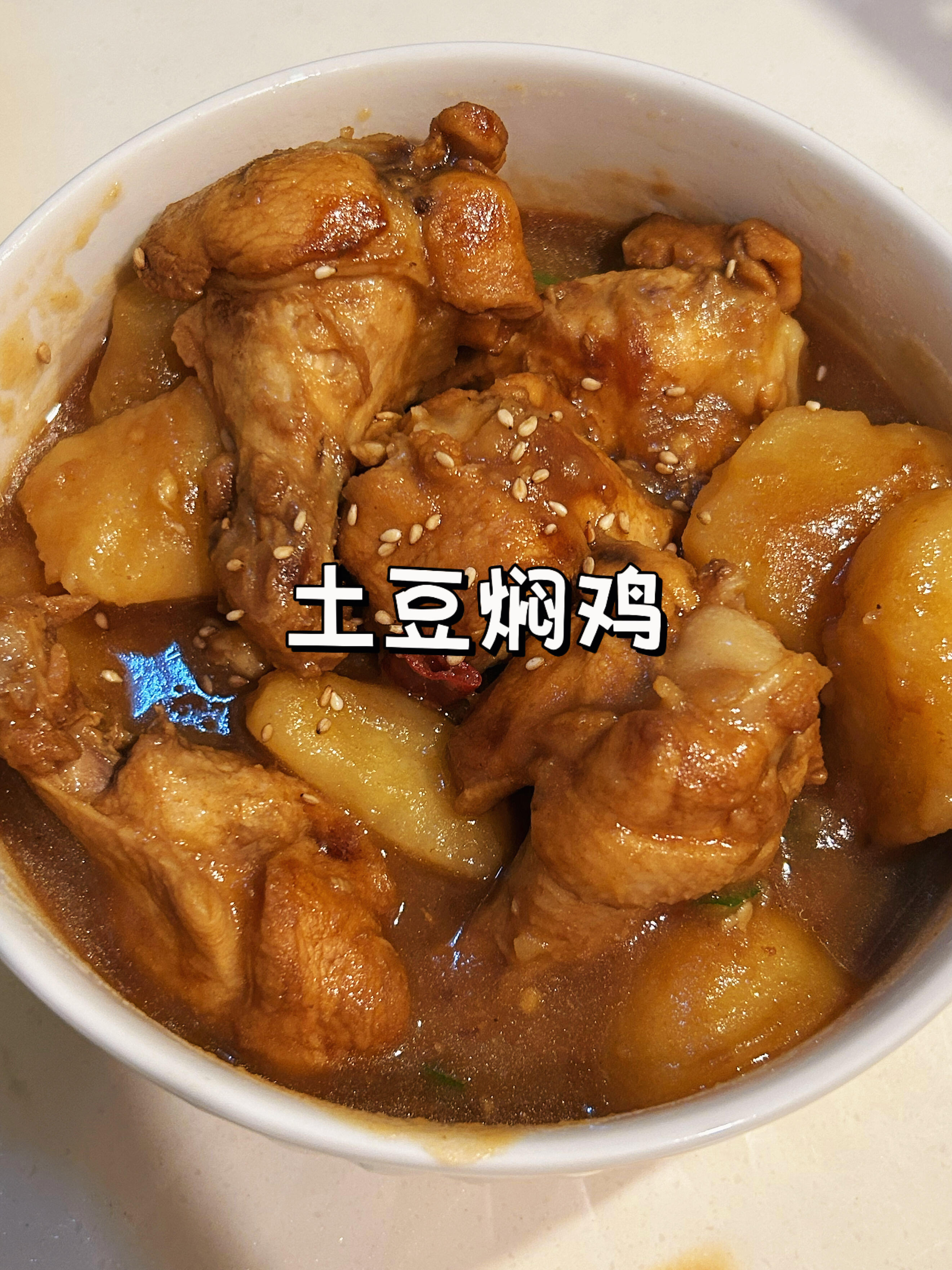 时间到!打开锅盖,大火收汁。这时候可以尝一下味道,根据个人口味适当调整。然后撒点葱花和芝麻点缀一下,一锅色香味俱全的土豆焖鸡就完成了!