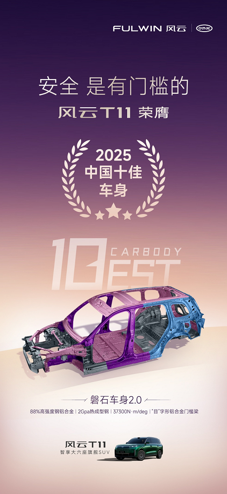 9月,智享大六座旗舰SUV——风云T11凭借卓越的车身设计与安全性能,荣获“2025中国十佳车身”称号。这一权威荣誉不仅是对风云T11产品力的高度认可,更标志着奇瑞在车身安全研发与制造领域已跻身世界顶尖水平。