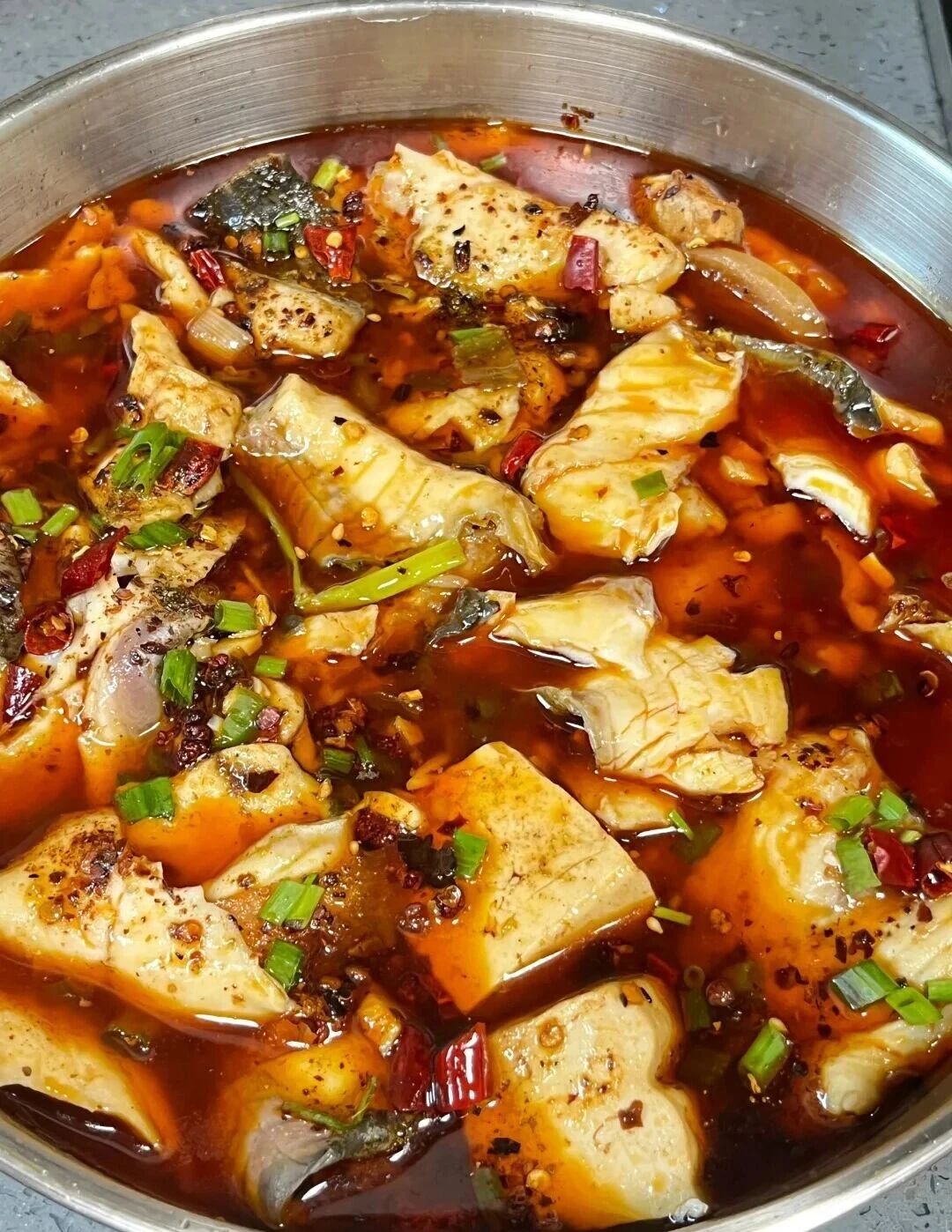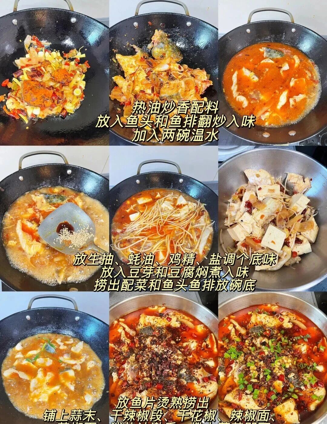鱼头、鱼排、鱼片、豆腐、豆芽、葱、姜、蒜、泡椒、泡萝卜(或酸菜)、干花椒、干辣椒