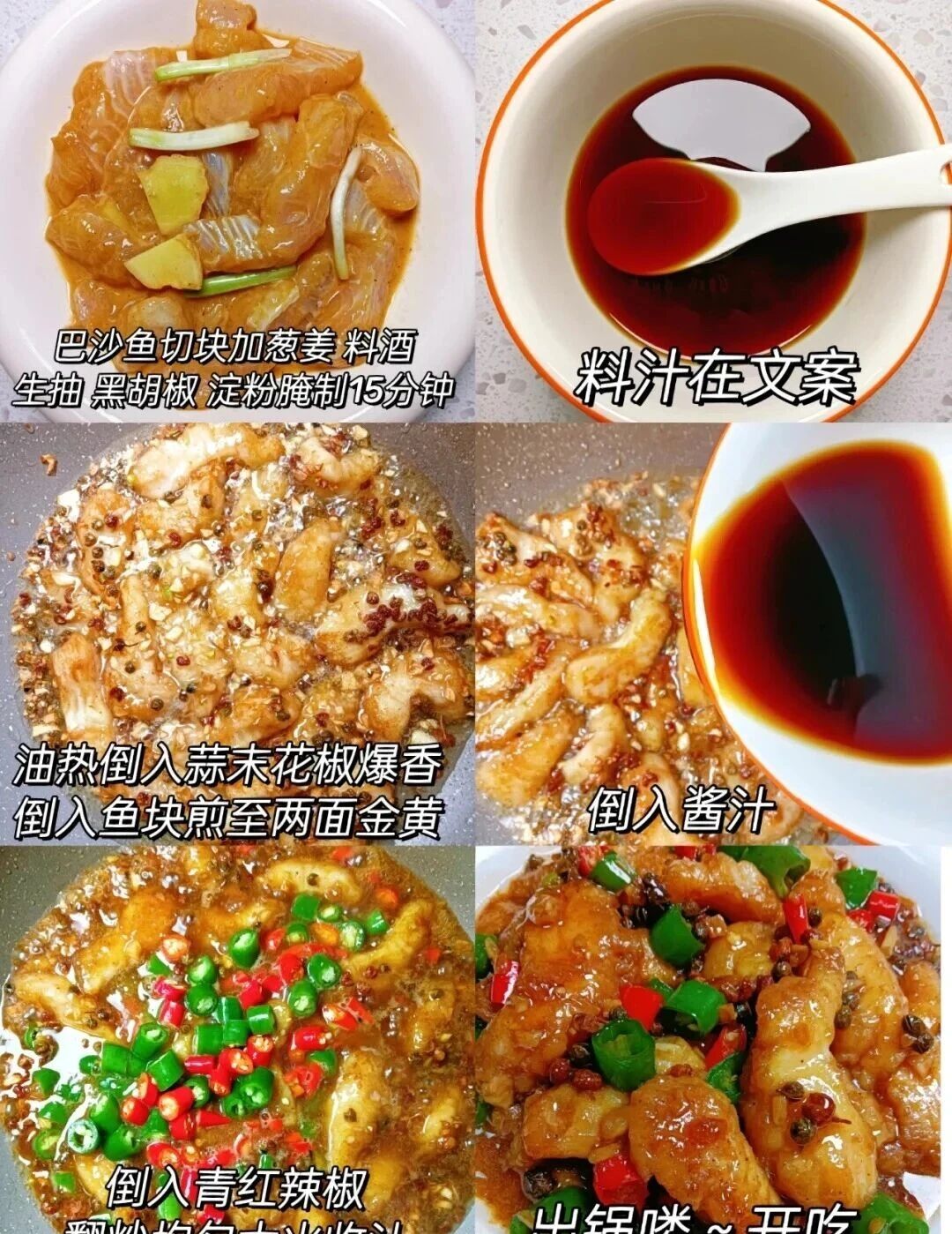 巴沙鱼、青红椒、大蒜、花椒、小葱、生姜、料酒、生抽、老抽、淀粉、黑胡椒、白糖、食用油