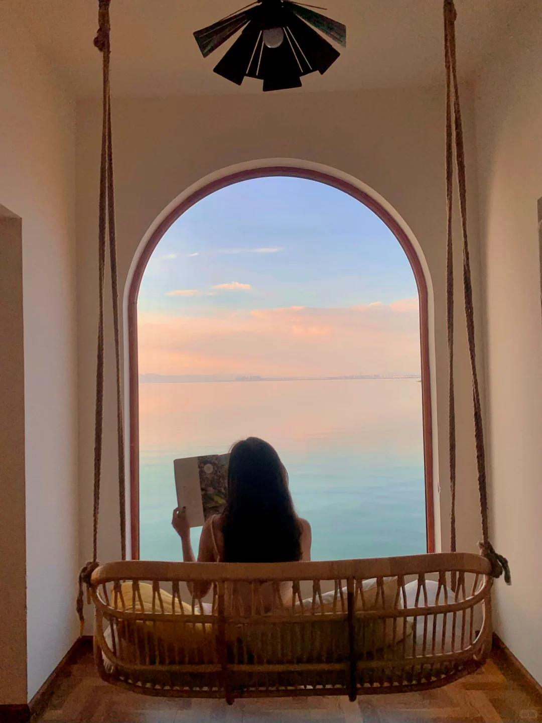 白日看滇池碧波,下午守候壮丽日落,夜晚还能临窗小酌。二楼的静谧书桌、三楼的悠闲秋千、四楼的宽阔露台,每一层都有不同的体验。