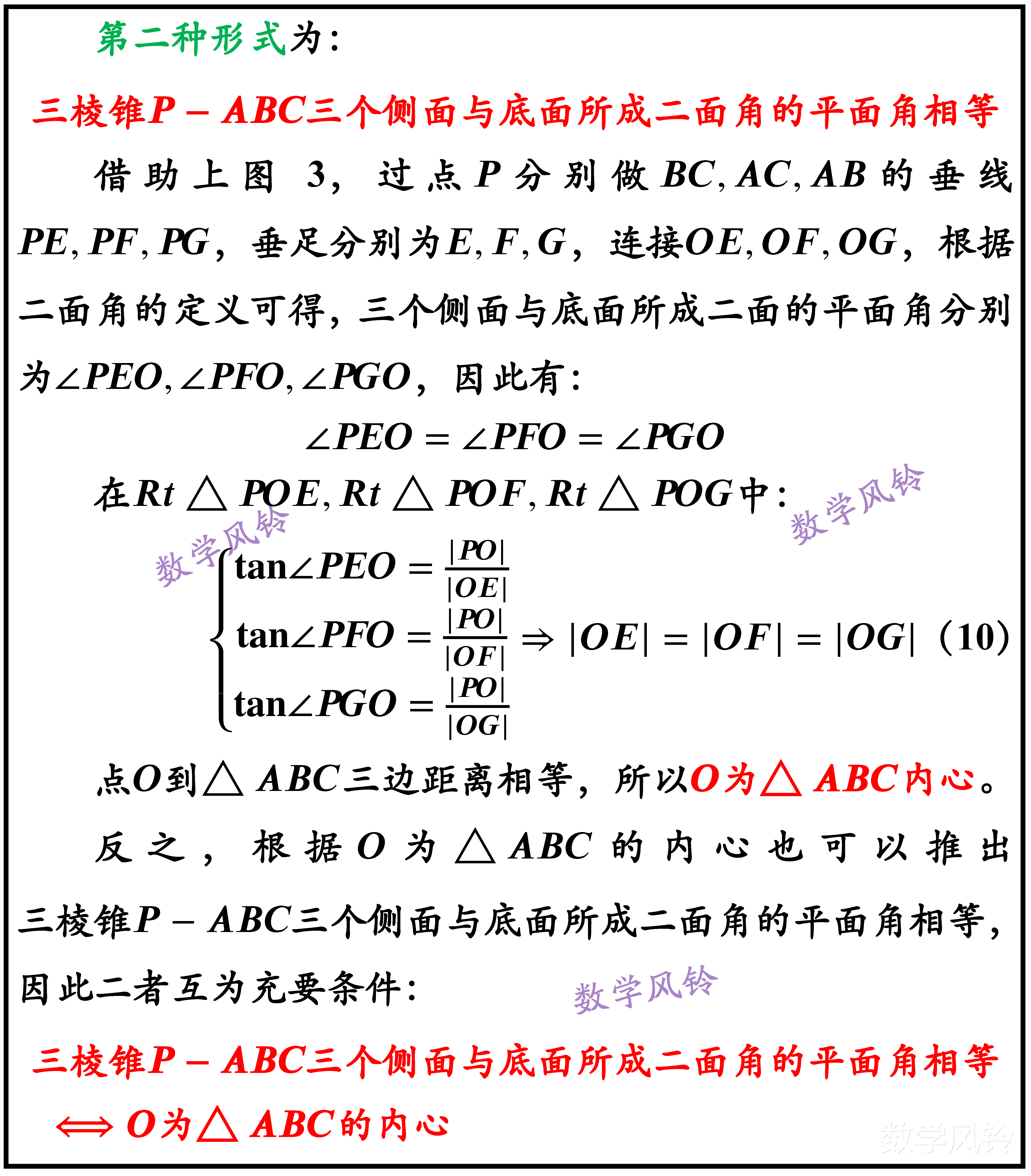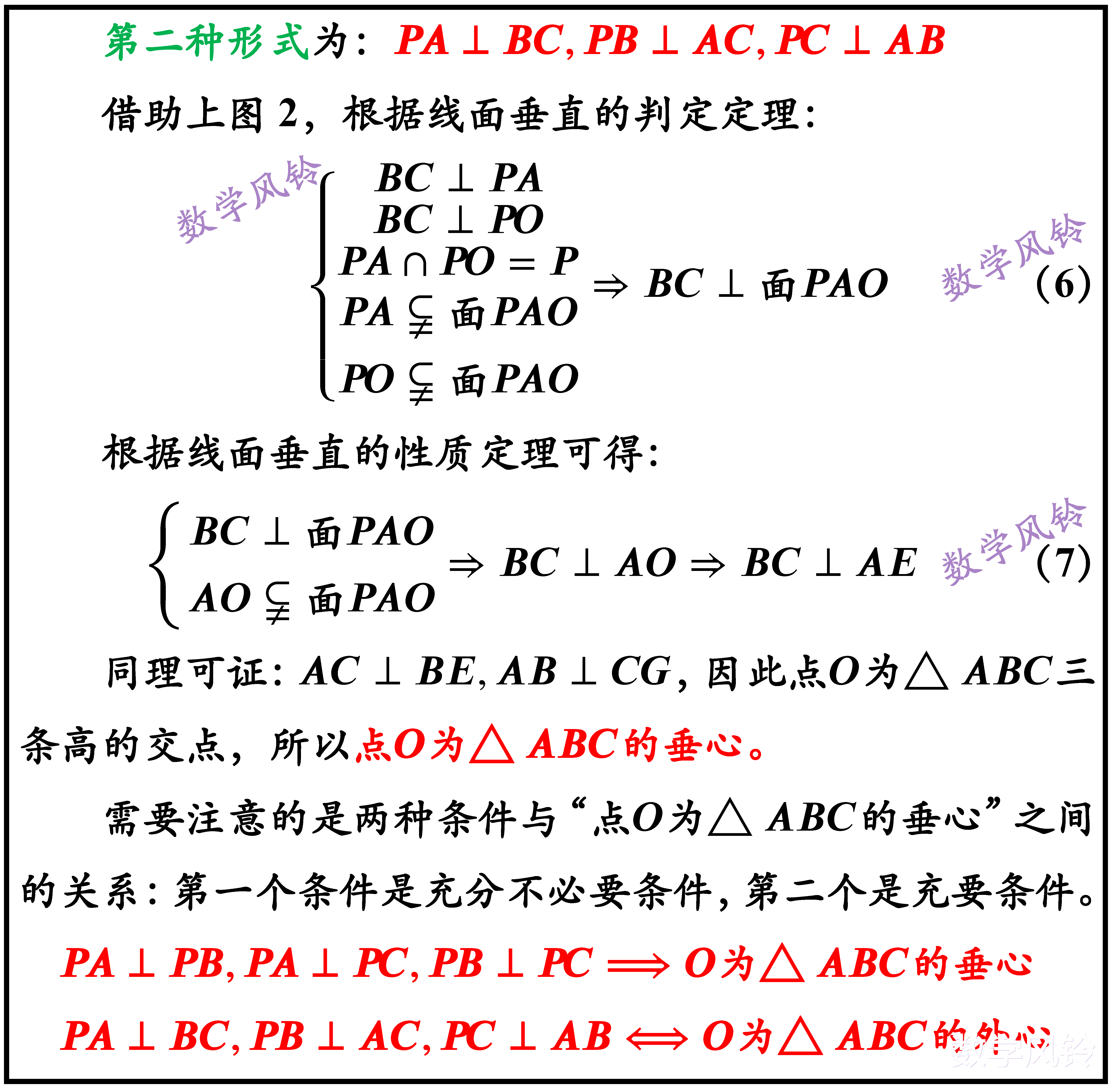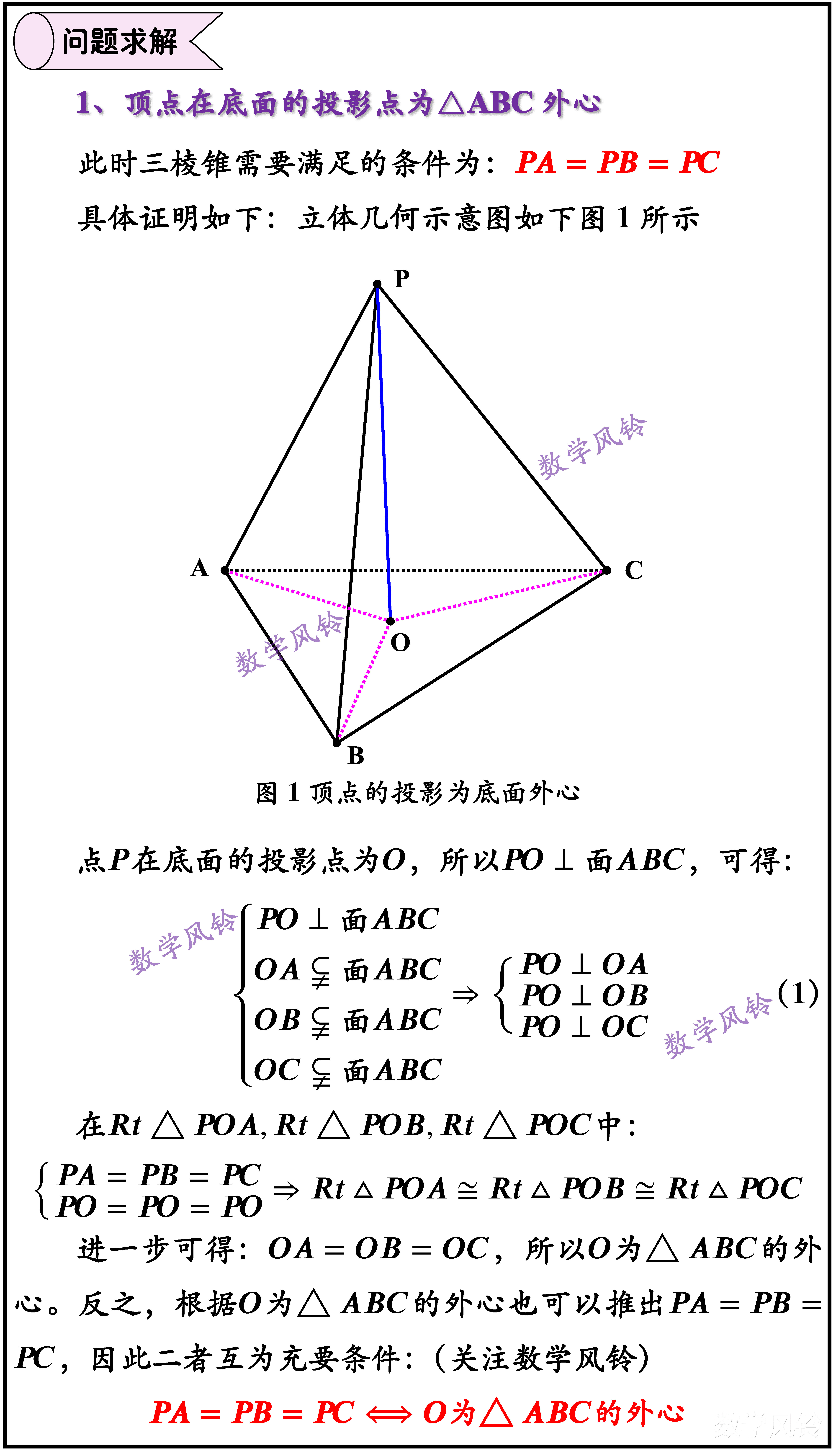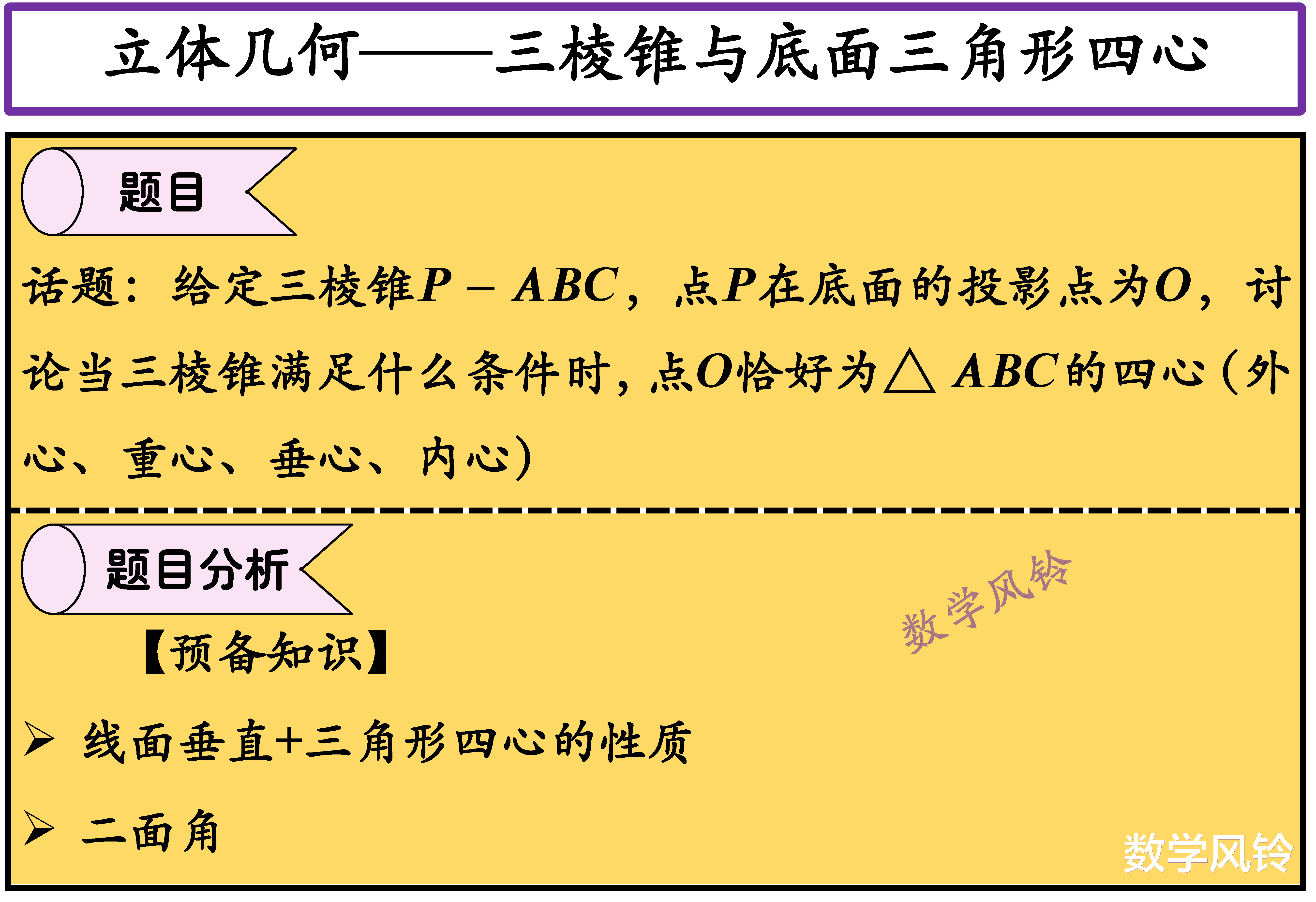 在立体几何中,三棱锥是一个重点考察模型,其中有这样一类经典题目:三棱锥顶点在底面的投影与底面三角形四心的关系,在不同的条件之下,三棱锥顶点在底面的投影可以成为底面三角形的外心、垂心、内心、重心,这类题目背后考察的知识点就是立体几何中线面垂直的判定定理和性质定理、二面角的定义以及三角形四心的性质,本期对于这类题目模型做一个系统性的总结,帮助大家彻底掌握这类题目的分析。