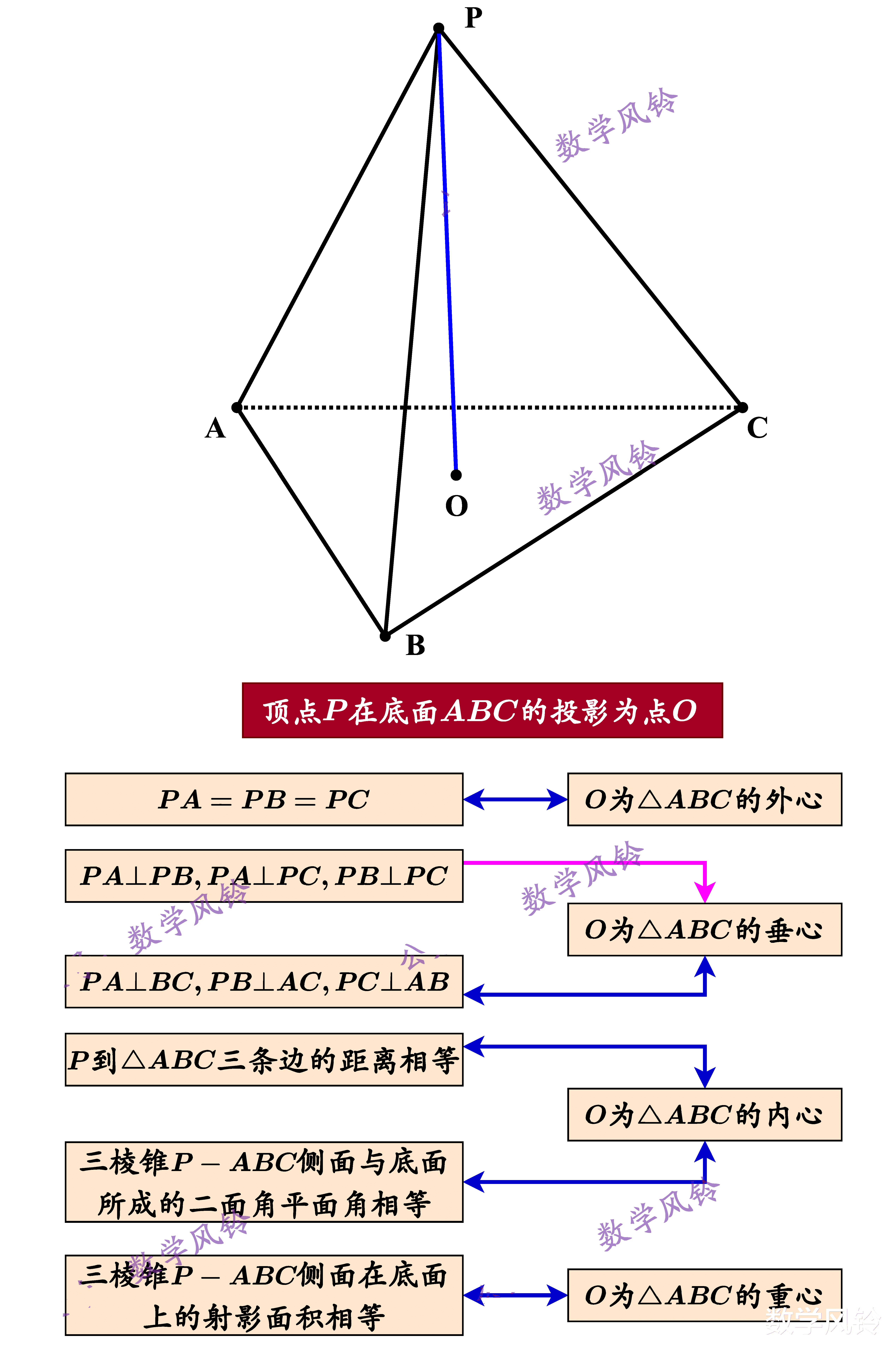 综上所述,掌握上述四种情况下三棱锥顶点在底面的投影与底面三角形四心的分析,后续遇到这类题目即可快速秒杀,背后涉及到的理论知识也是比较基础的,主要就是线面垂直相关定理的应用,最后对三棱锥与底面三角形四心的模型关系做如下总结,如下图所示: